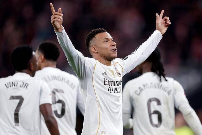 姆巴佩在2025年的爆发不仅体现在俱乐部层面,在全球年度射手榜上同样名列前茅。根据11月底的数据,姆巴佩以55球领跑全球射手榜,紧随其后的是拜仁的凯恩54球,而哈兰德以51球排名第三,显示出他在国际赛场的绝对竞争力。 进入12月,姆巴佩的年度进球数进一步上升至62球,其中为皇马打入55球,为法国国家队贡献7球。这一成绩已经超过了C罗2014年的61球和梅西2010年的60球,位列21世纪自然年进球榜第五名。目前他在榜单上仅次于梅西2012年的91球、C罗2013年的69球、莱万2021年的69球以及C罗2012年的63球。 皇马主帅阿隆索对姆巴佩的转型起到了关键作用。他给了姆巴佩更多自由发挥的空间,使他不再只是单纯的射手,而是全面参与球队进攻组织,提升了前场回追和反抢能力。虽然姆巴佩2025年的数据十分亮眼,但与足球史上自然年进球纪录,尤其是梅西2012年的91球神话相比,仍存在一定差距。 姆巴佩的高产出不仅在西甲联赛持续闪耀,在欧冠赛场同样表现惊人。11月27日欧冠联赛第5轮,皇马客场以4-3逆转奥林匹亚科斯,姆巴佩独中四球,上演大四喜,成为皇马队史上第四位在欧冠比赛中完成大四喜的球员。